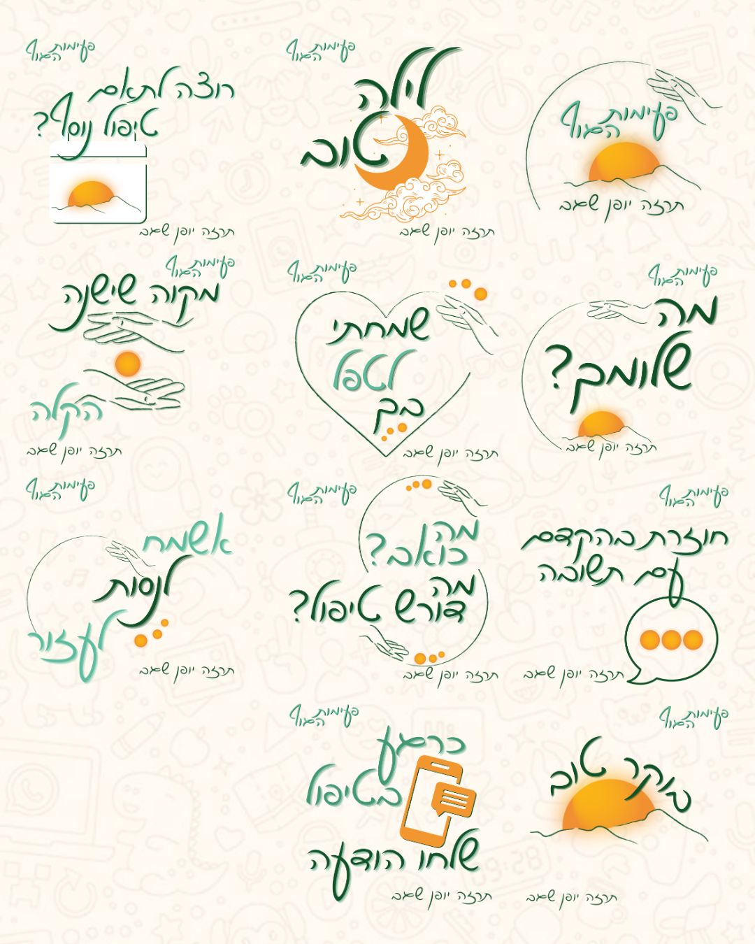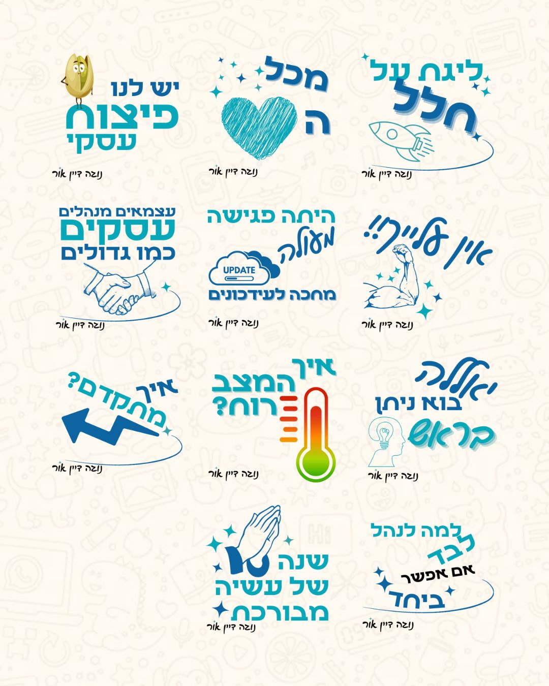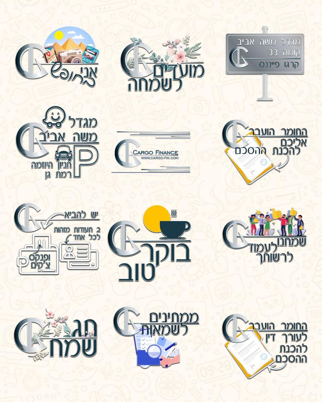 אספנו יחד משפטים שחוזרים על עצמם בתקשורת השוטפת, פירקתי את הלוגו לשימוש יצירתי בעיצוב הסטיקרים, ויצרנו אוואטר מותאם לעסק. התוצאה – סטיקרים ייחודיים שמחברים בין המותג ללקוחות בצורה אישית, חמה וזכירה.