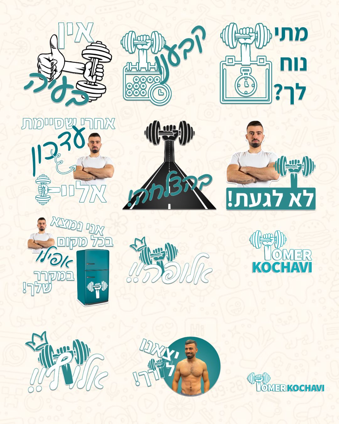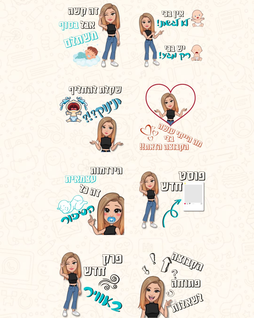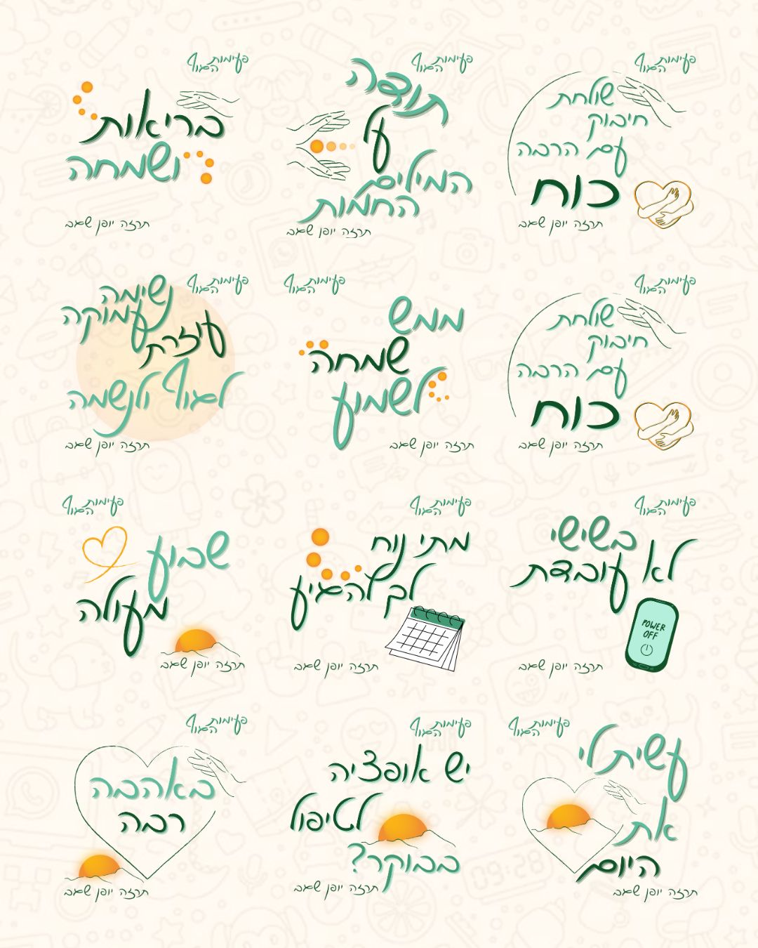אספנו יחד משפטים שחוזרים על עצמם בתקשורת השוטפת, פירקתי את הלוגו לשימוש יצירתי בעיצוב הסטיקרים, ויצרנו אוואטר מותאם לעסק. התוצאה – סטיקרים ייחודיים שמחברים בין המותג ללקוחות בצורה אישית, חמה וזכירה.
