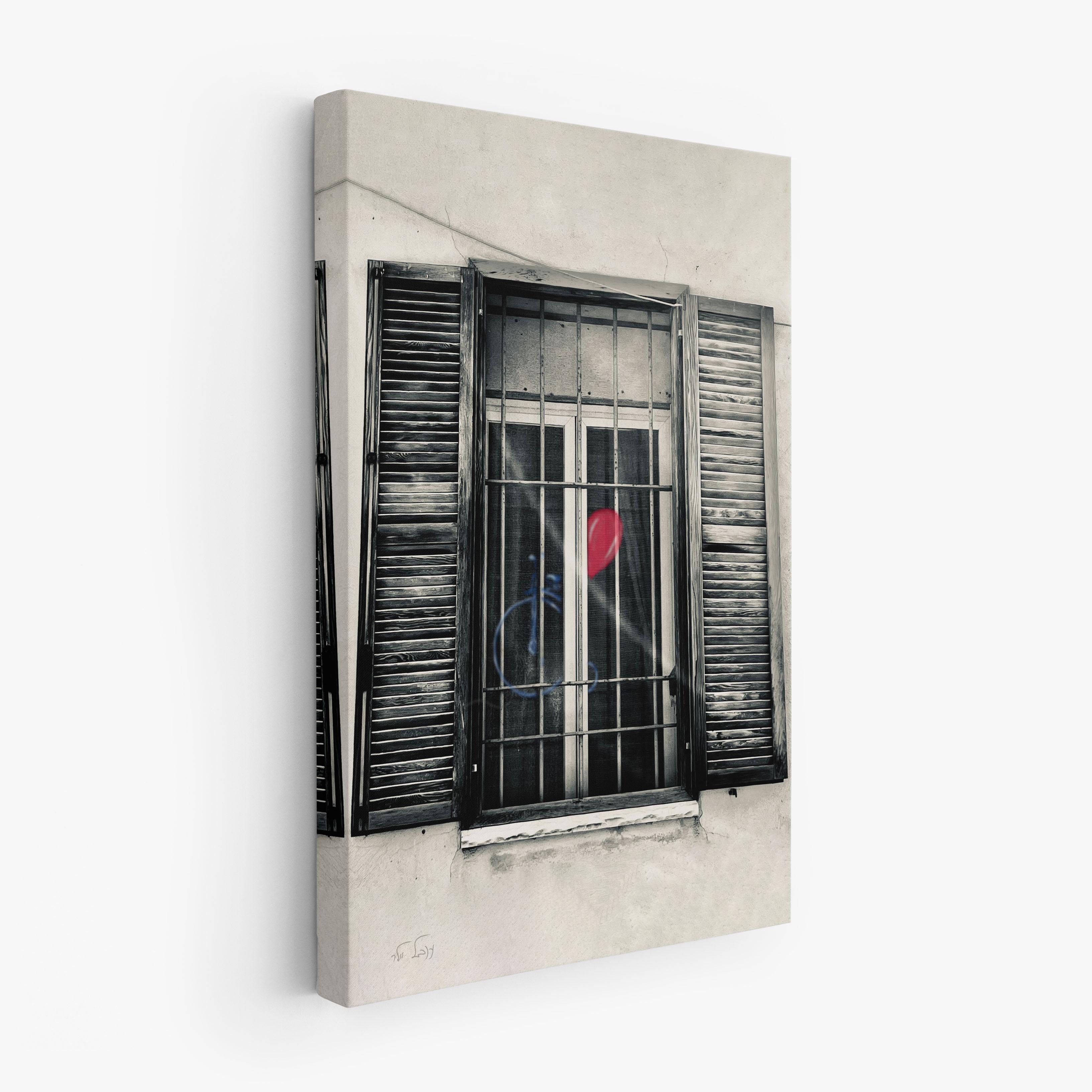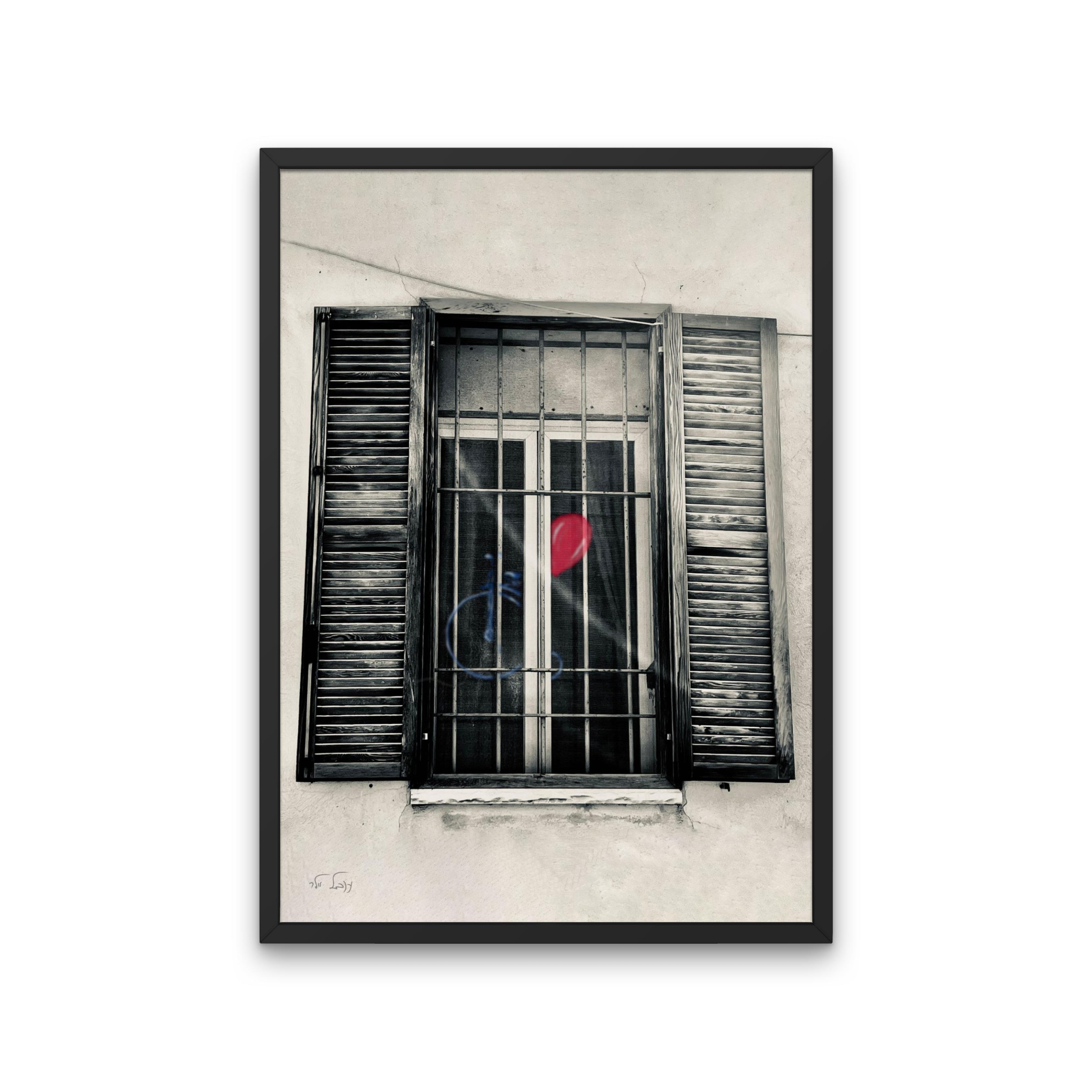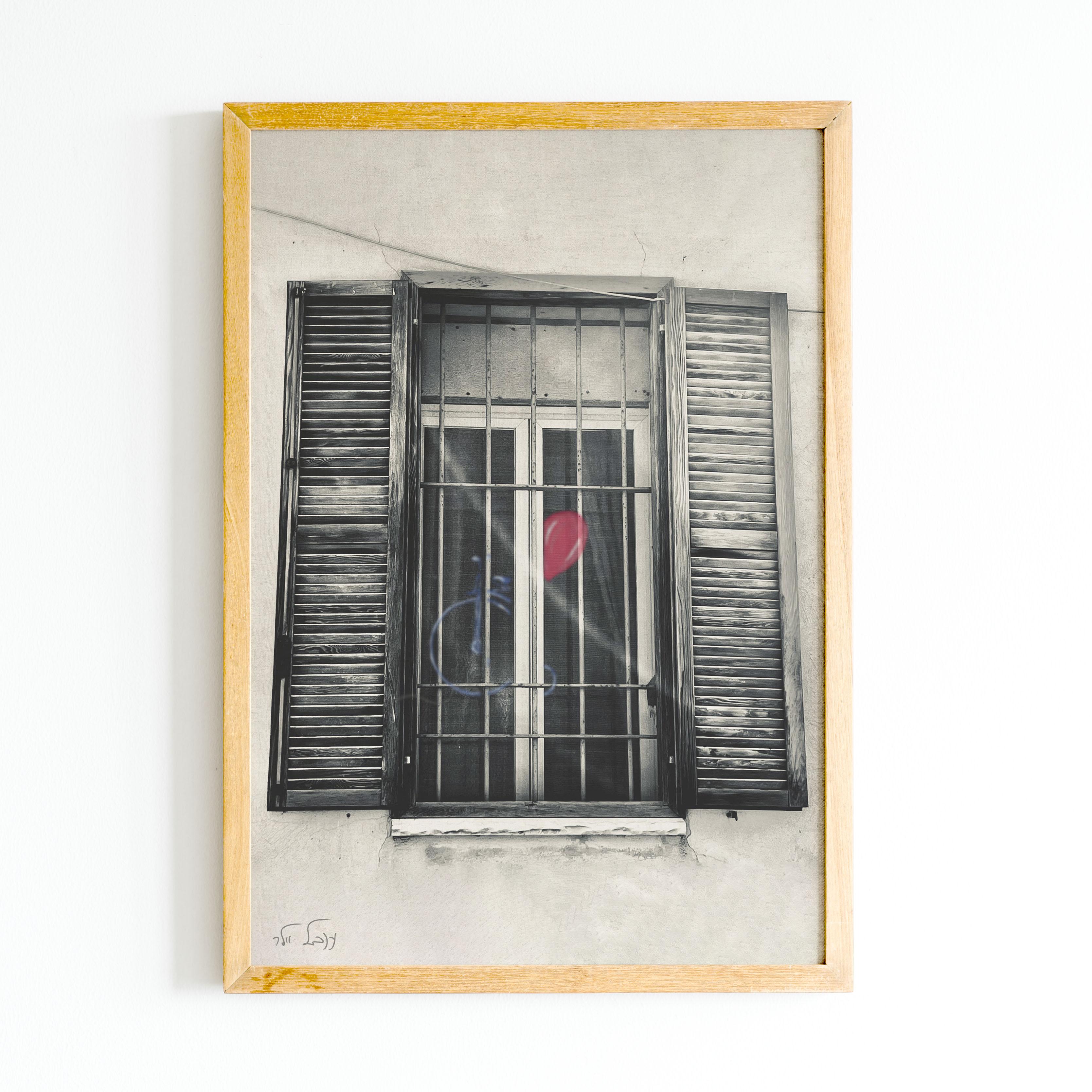 צילום ועיבוד תמונה לחלון נוסטלגי, עם תוספת של אופניים ובלון אדום.
