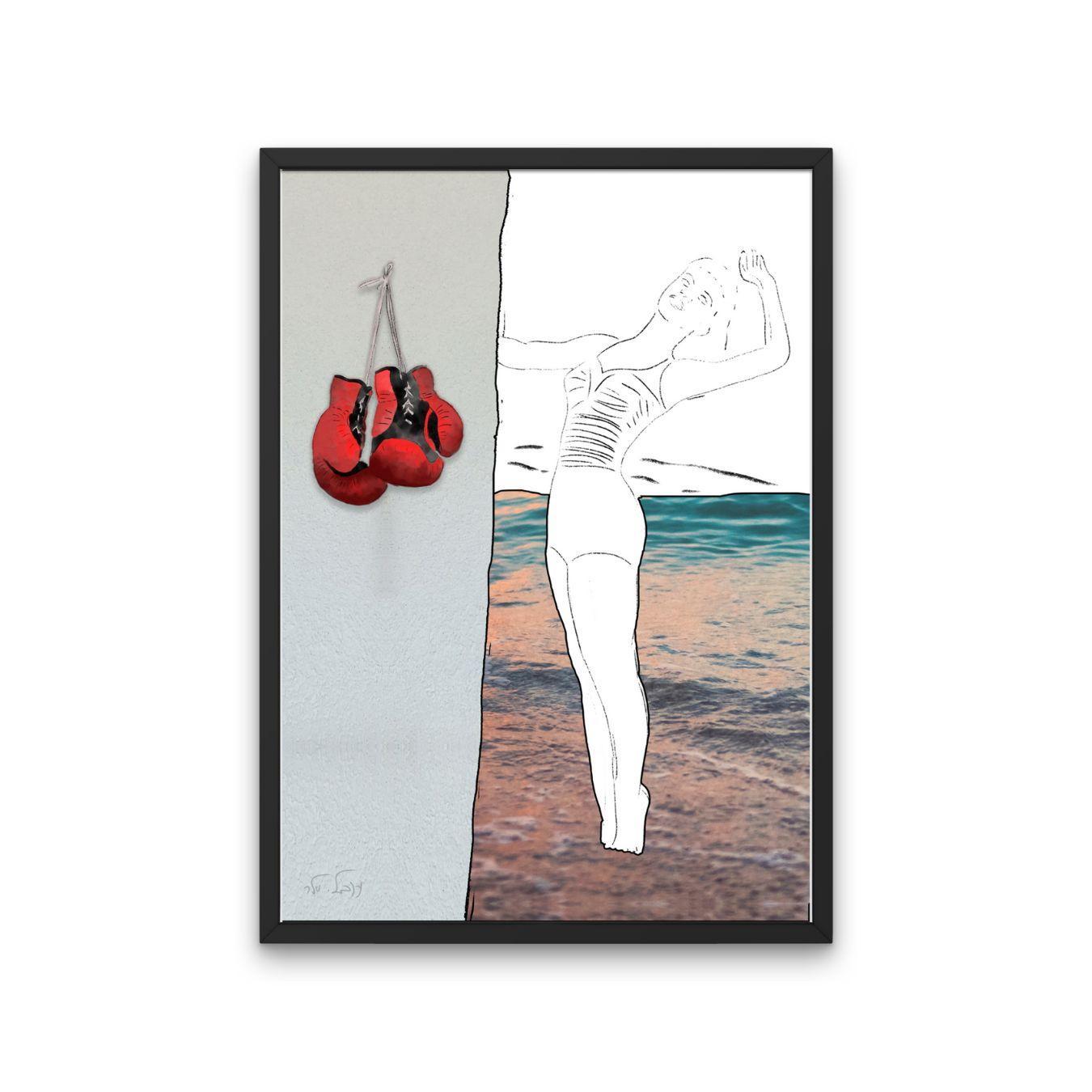 קולאז׳ סוריאליסטי של אישה בקווים מינימליסטיים עומדת בגבה לים, לידה כפפות אגרוף. קולאז׳ שמייצר תהיה וסיפור.