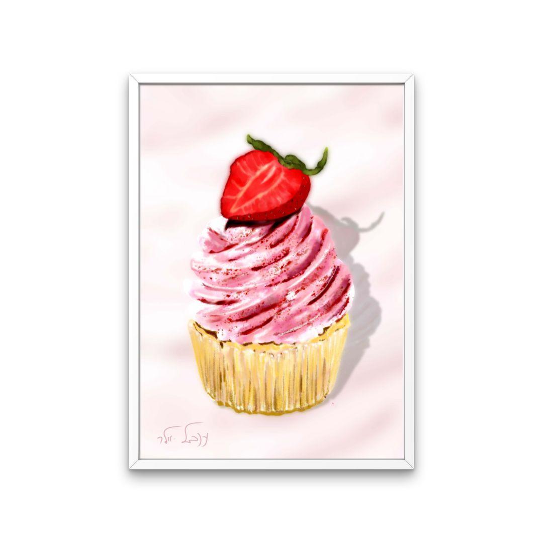 איור צבעוני ושמח של קאפקייק ורוד ומעליו תות.